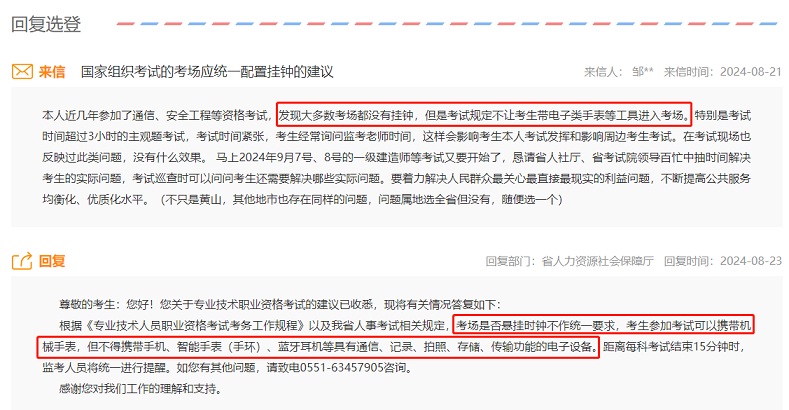 随着一级建造师考试临近,有网友向人社厅建议国家组织的考试考场应统一配置挂钟!针对考生反映的此问题,安徽人社厅回复如下。