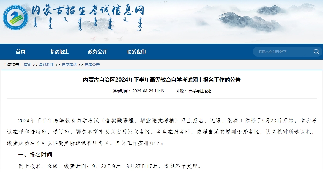 9月23日9时-9月27日17时,考生登录内蒙古招生考试信息网自学考试栏目的报名报考系统,按提示流程进行网上报名、缴费,报名费标准为30元/科;如未能按时缴费,视为放弃本次报考申请。本次网上缴费仅为2024年下半年实践课程、毕业论文报名费,实践课程、毕业论文考核费用由主考学校按有关主管部门规定核收,考生网上报名成功后要主动与主考学校联系,确定考核时间、地点、方式等,并及时参加考核(联系方式见自学考试栏目主考院校联系方式)。注意:考生未在下半年完成实践课程考核(毕业论文考核)或实践课程考核(毕业论文考核)未通过,后续再报名还需网上缴纳报名费。