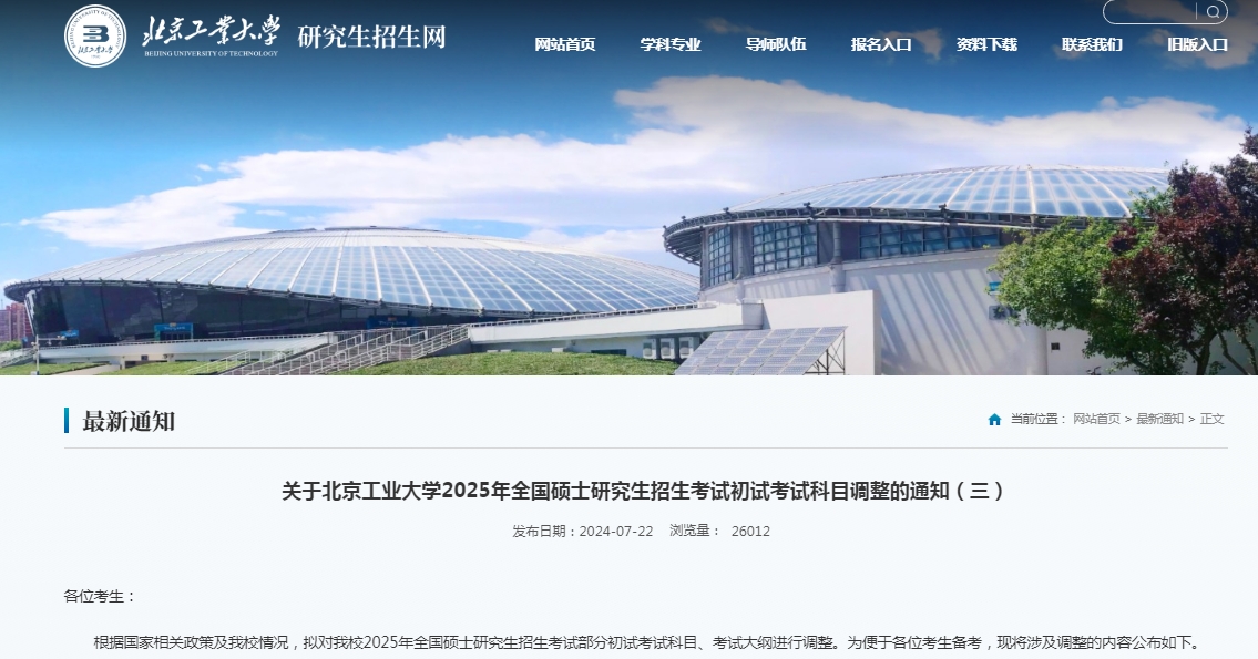 近日,北京工业大学研究生院发布了《关于北京工业大学2025年全国硕士研究生招生考试初试考试科目调整的通知(三)》。根据公告内容,2025年该校部分硕士研究生初试科目和考试大纲将进行调整。本文将为考生详细解析此次调整的具体细节,帮助大家及时掌握最新信息,并据此调整备考计划。