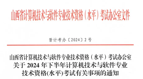 根据人力资源社会保障部《关于2024年度专业技术人员职 业资格考试工作计划及有关事项的通知》(人社厅发〔2024〕1 号),全国计算机专业技术资格考试办公室《关于2024年度计算 机技术与软件专业技术资格(水平)考试工作安排及有关事项的 通知》(计考办〔2024〕1号)要求,现就2024年全国下半年计 算机技术与软件专业技术资格(水平)考试山西考区的有关事项 通知如下: