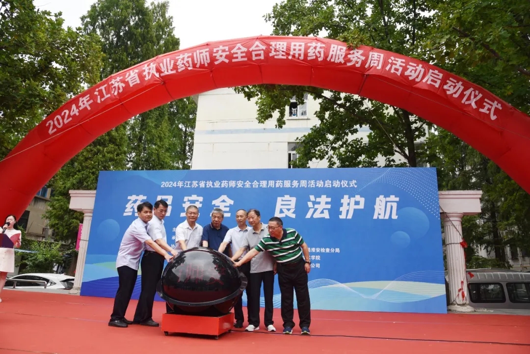 参加活动启动仪式的嘉宾江苏省执业药师协会原会长颜怀虎、江苏省执业药师协会秘书长王吉东、原秘书长滕金鹏、淮安市市场监督管理局副局长杨兆权、江苏省药品监督管理局淮安检查分局局长王健、淮安市药学会理事长葛于元、淮安市食品药品检验所所长金华,共同启动2024年江苏省执业药师安全合理用药服务周活动。