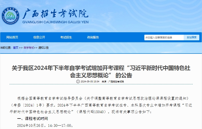 根据全国高等教育自学考试指导委员会《关于调整高等教育自学考试思想政治理论课课程设置的通知》(考委〔2024〕1号)要求,2024年下半年广西高等教育自学考试在专、本科层次专业中增加开考课程“习近平新时代中国特色社会主义思想概论”(课程代码15040)。现将有关事项公告如下: