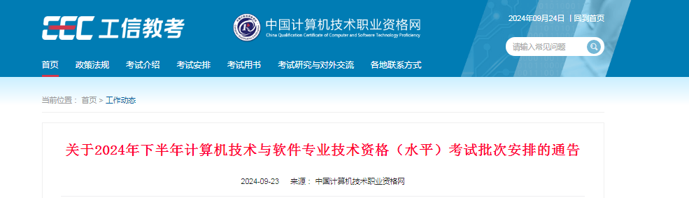 关于2024年下半年计算机技术与软件专业技术资格(水平)考试批次安排的通告