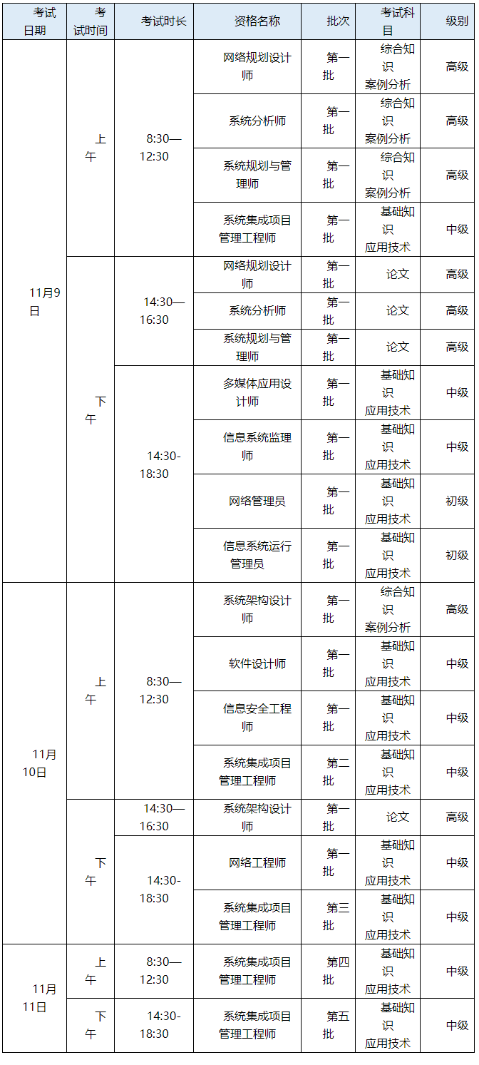 软考办发布了《关于2024年下半年计算机技术与软件专业技术资格(水平)考试批次安排的通告》,通知中对2024年下半年软考考试时间及考试批次作了安排,此次考试时间安排在11月9日-11日,考试批次安排详见下文。