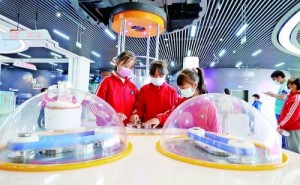 2021年12月17日,在广西柳州科技馆,学生们在操控和体验科学仪器。当日,2021年柳州科技馆“科技研学,让课本知识‘活起来’