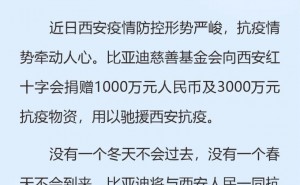 1 月 4 日消息,今日上午,比亚迪宣布捐赠现金及物资 4000 万元驰援西安。比亚迪表示,近日西安疫情防控形势严峻,抗疫