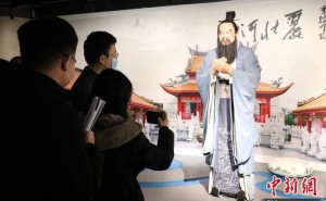 媒体一行人参观孔子蜡像。 李明芮 摄中新网济南12月25日电 (李明芮)山东连续五年举办文化和旅游惠民消费季活动,智慧文旅、