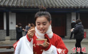 工作人员身穿汉服,为各地游客分发腊八粥,送去温暖和祝福。 刘鸿儒 摄山东曲阜1月10日电(李明芮 陈曙光 张艳)农历腊月初