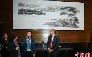 旅法华裔画家范一夫(前排中)致答谢词 陶然天供图北京2月23日电 (记者 应妮)旅法华裔画家范一夫巨制山水作品《朝霞敛红烟·