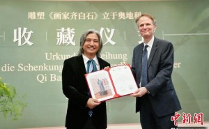 奥地利驻华特命全权大使利肯(右)向吴为山(左)转交维也纳世界博物馆收藏证书 史春阳 摄北京2月24日电 (记者 应妮)中国美术