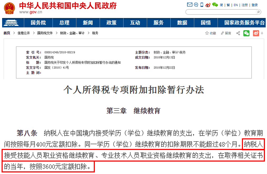 《个人所得税专项附加扣除暂行办法》中规定,纳税人接受技能人员职业资格继续教育、专业技术人员职业资格继续教育的支出,在取得相关证书的当年,按照3600元定额扣除。