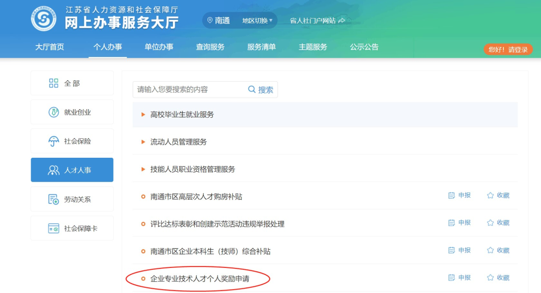 申请人通过江苏省人力资源和社会保障厅网上办事服务大厅(https://rs.jshrss.jiangsu.gov.cn/index/)登录后,在“个人办事”→“人才人事”中选择“企业专业技术人才个人奖励申请”,核对个人相关信息无误后,下载打印《南通市市区企业专业技术人才个人奖励申报表》,由单位盖章后,送至区人社部门或市有关部门初审盖章后作为申报材料扫描上传,市人社部门统一复核。具体奖励通知可在市人社局官网“职称专栏”查询。
