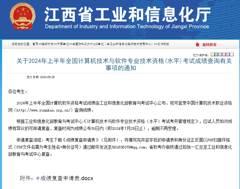 江西工信厅发布了《关于2024年上半年全国计算机技术与软件专业技术资格(水平)考试成绩查询有关事项的通知》,据通知可知,江西2024年上半年计算机软考成绩复查时间为成绩公布30日内(即2024年7月25日止),逾期不再受理。