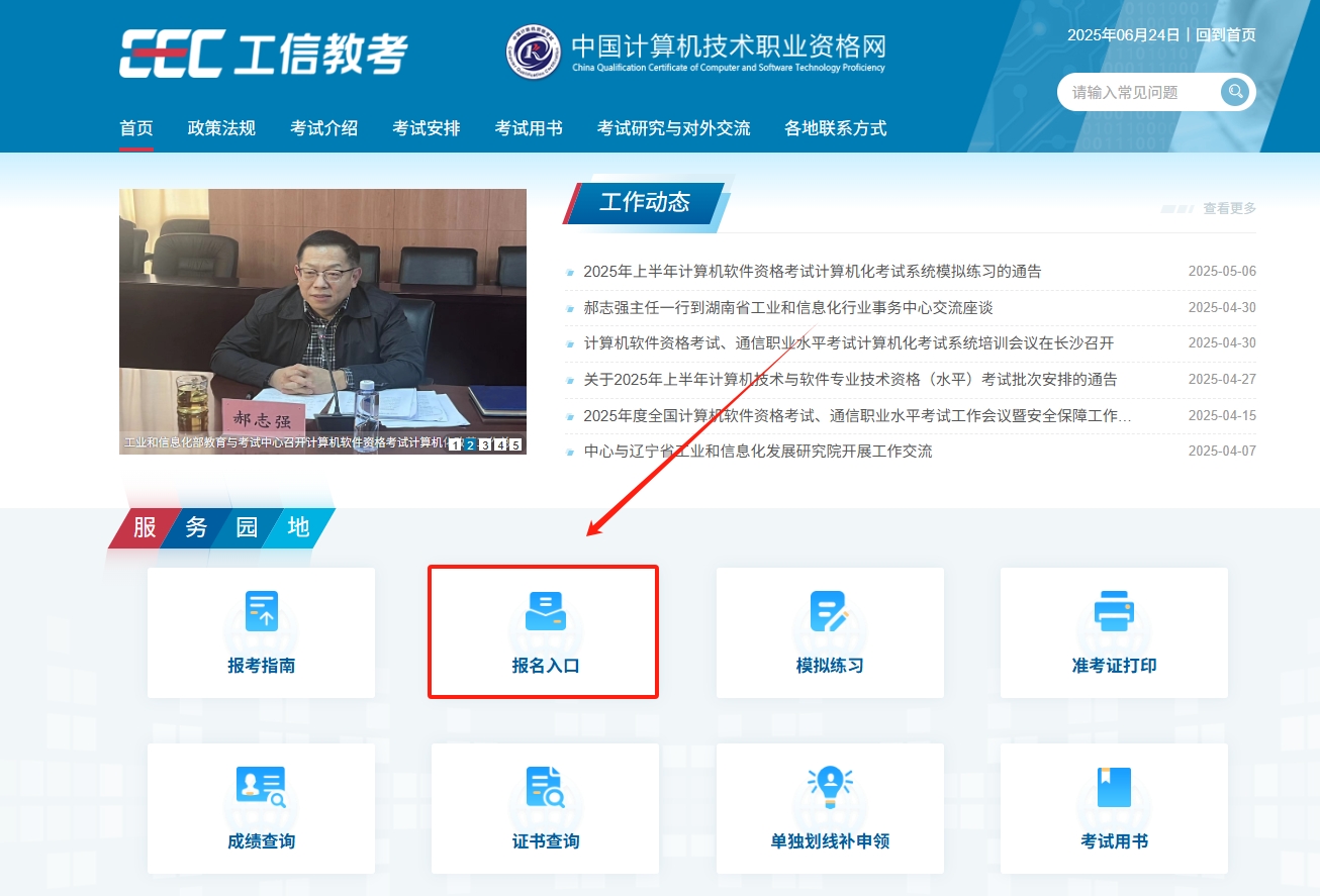 2025年下半年软考中项考试报名入口是全国计算机技术与软件专业技术资格(水平)考试网上报名平台。考生需通过浏览器访问中国计算机技术职业资格网,该网站有两个常用网址:http://www.ceac.gov.cn/或https://www.ruankao.org.cn/。进入网站首页后,找到并点击“服务园地”模块中的“报名入口”链接,即可跳转至报名平台。