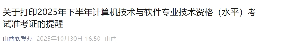 官方通知!山西2025下半年计算机软考准考证打印提醒!