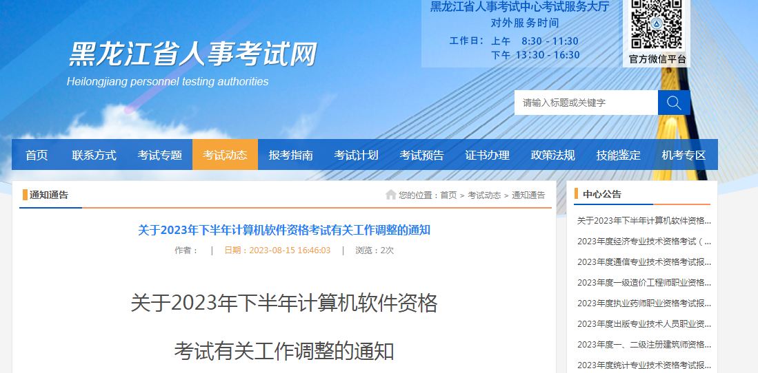 2023年8月15日,黑龙江人事考试网发布了《关于2023年下半年计算机软件资格考试有关工作调整的通知》,由通知可知,黑龙江2023年下半年软考中级考试将实行机考,报名时间调整为9月6日至12日,请考生注意考试时间变化及时进行报名。