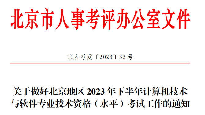 根据原北京市人事局、原北京市信息化工作办公室关于转发人事部、信息产业部关于印发计算机技术与软件专业技术资格(水平)考试暂行规定和计算机技术与软件专业技术资格(水平)考试实施办法的通知的通知(京人发2003138号),全国计算机专业技术资格考试办公室关于2023年度计算机技术与软件专业技术资格(水平)考试工作计划及有关事项的通知(计考办20231号),工业和信息化部教育与考试中心关于2023年下半年计算机软件资格考试有关工作调整的通知(工信教202342号)精神,现将北京地区2023年下半年计算机技术与软件专业技术资格(水平)考试有关事宜通知如下: