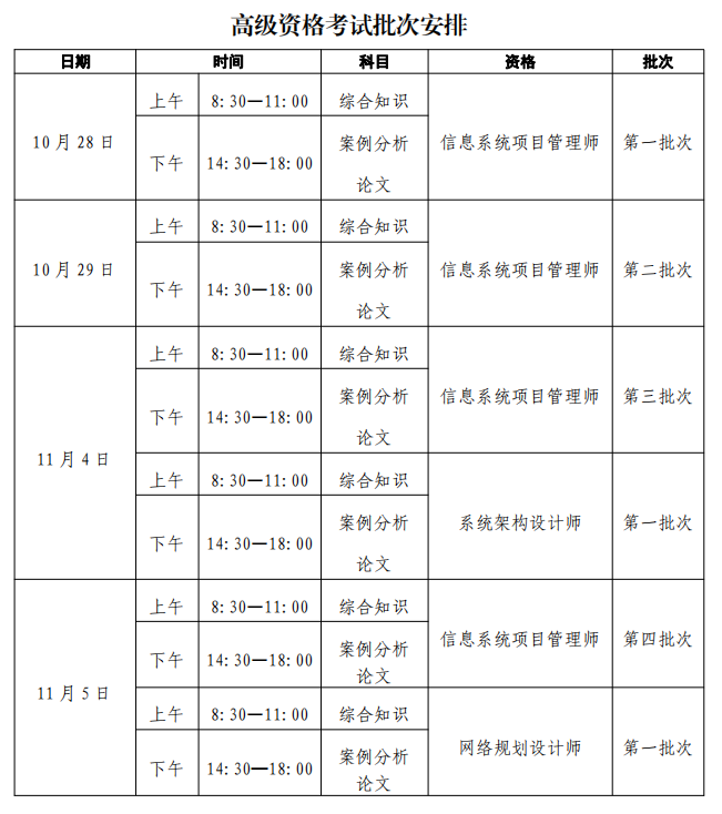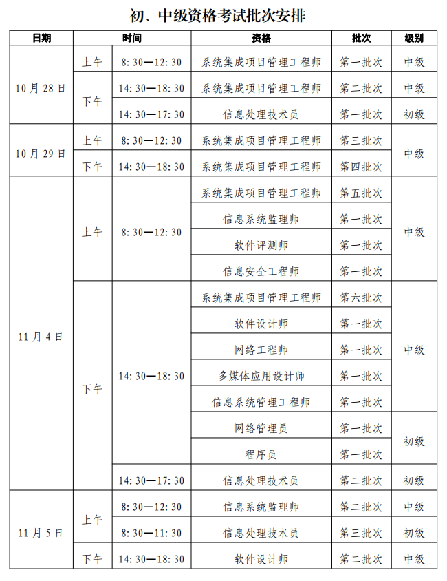 信息系统项目管理师、系统集成项目管理工程师、信息处理技术员、软件设计师、信息系统监理师5个资格考试因报考人数较多,为确保报考人员均有机位可考,部分考区将对上述5个资格考试采取分批次实施的办法,请各位考生及时关注当地计算机软件资格考试办公室的通知,按准考证上的时间、地点和批次参加考试,也请广大考生对此予以理解和支持。