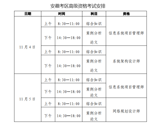 安徽2023年下半年软考考试批次及时间安排公布,根据安徽人事考试网《关于2023年下半年计算机技术与软件专业技术资格(水平)考试批次安排的通告》可以得知,安徽2023年下半年软考高级考试时间安排在11月4日和5日。