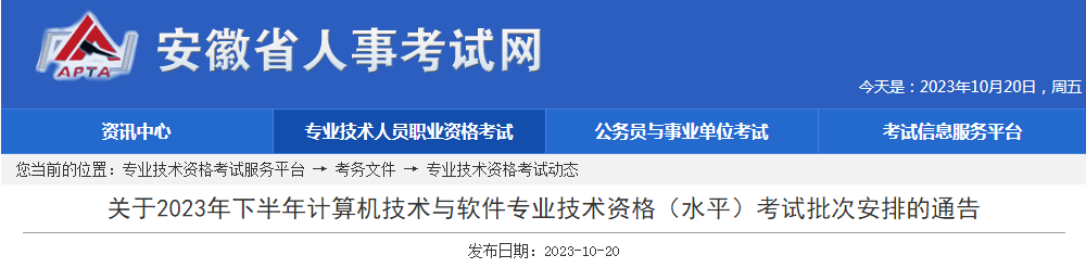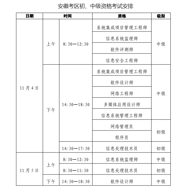 安徽2023年下半年软考中级考试批次及时间安排通知