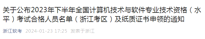 关于公布2023年下半年全国计算机技术与软件专业技术资格(水平)考试合格人员名单(浙江考区)及纸质证书申领的通知