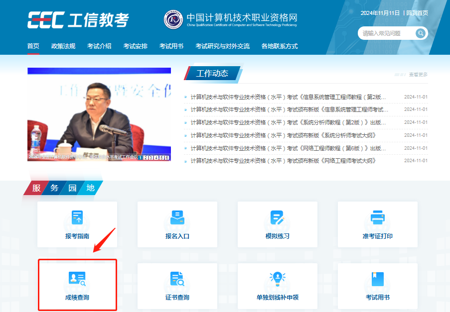 1、进入中国计算机技术职业资格网(https://www.ruankao.org.cn/),选择页面下方右侧的“成绩查询”;