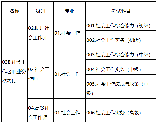 社会工作者职业资格考试分为三个考试管理,考试名称、级别、专业及考试科目信息设置为: