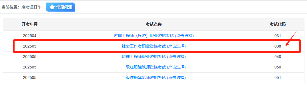 2.在列表里选择要打印准考证的考试:社会工作者考试,确定好开考年月:202505,考试代码:038。