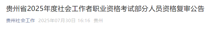 贵州省2025年度社会工作者职业资格考试部分人员资格复审公告