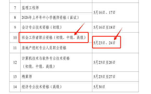 ​中国人事考试网2月3日发布了《人力资源社会保障部办公厅关于2026年度专业技术人员职业资格考试工作计划及有关事项的通知》,其中明确了2026年社会工作者考试时间为5月23日-5月24日。