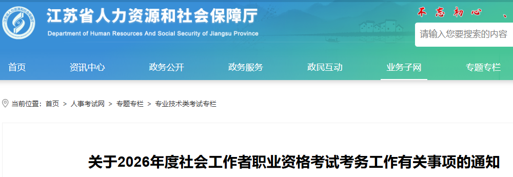根据人力资源和社会保障部人事考试中心《关于2026年度 社会工作者职业资格考试考务工作的通知》(人考中心函〔2026〕 2号)和《江苏省人力资源社会保障厅关于进一步加强我省专业 技术资格考试资格审查工作的通知》(苏人社发〔2018〕383号) 精神,为做好我省2026年度社会工作者职业资格考试考务工作,现将有关事项通知如下: