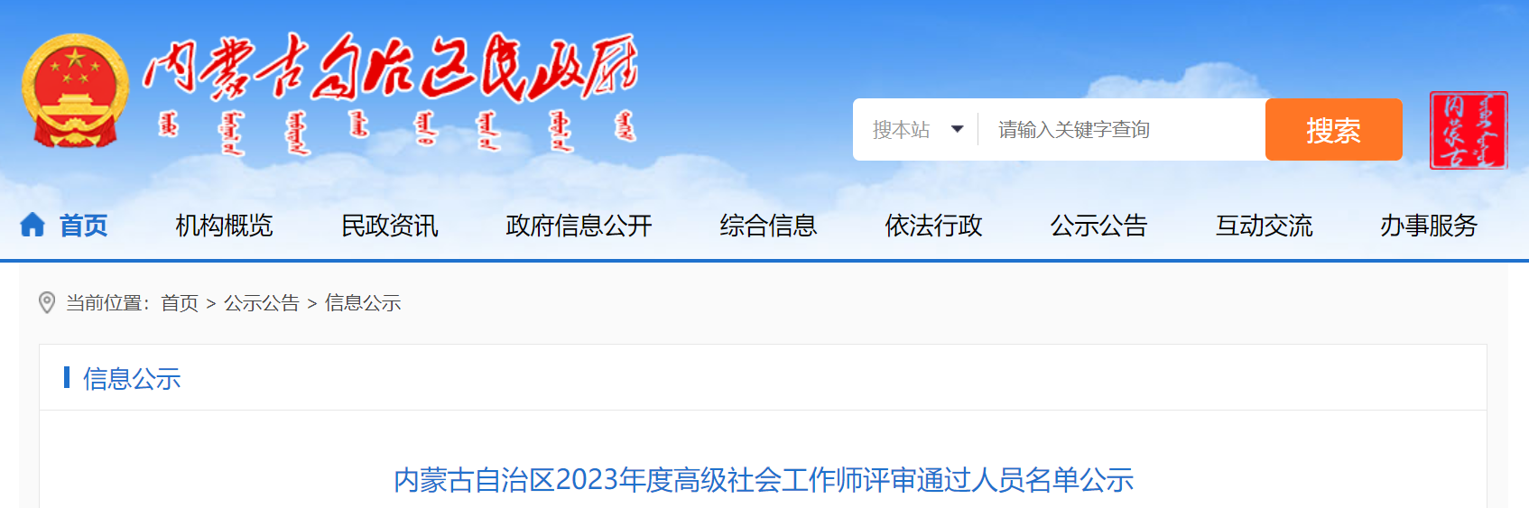 近日,内蒙古自治区人民政府发布《内蒙古自治区2023年度高级社会工作师评审通过人员名单公示》,内蒙古自治区2023年度高级社会工作师评审结果已公布,公示时间为8月7日至8月11日。