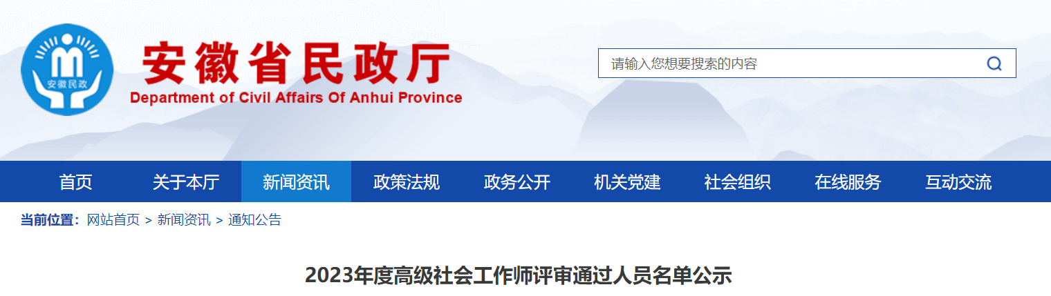 安徽省民政厅网站近日发布《2023年度高级社会工作师评审通过人员名单公示》,2023年安徽省有4名同志通过2023年度高级社会工作师评审,公示时间为:8月7日-8月11日。