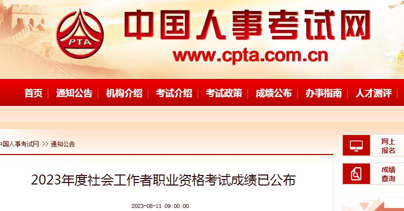 2023年度社会工作者职业资格考试成绩于2023年8月11日公布。请考生到本网站“成绩查询”栏目进行查询。成绩查询后,若您不想错过领证时间,可以点击本文标题下方的免费预约短信提醒,届时会以短信的形式提醒您,赶紧免费预约吧。