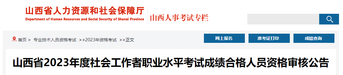 根据《山西省人事考试中心关于做好山西省2023年度社会工作者职业水平考试考务工作的通知》(晋人考函〔2023〕9号)安排,结合工作实际,2023年度社会工作者职业水平考试成绩合格人员资格审核工作采取线上审核方式进行,现将有关事项通知如下:
