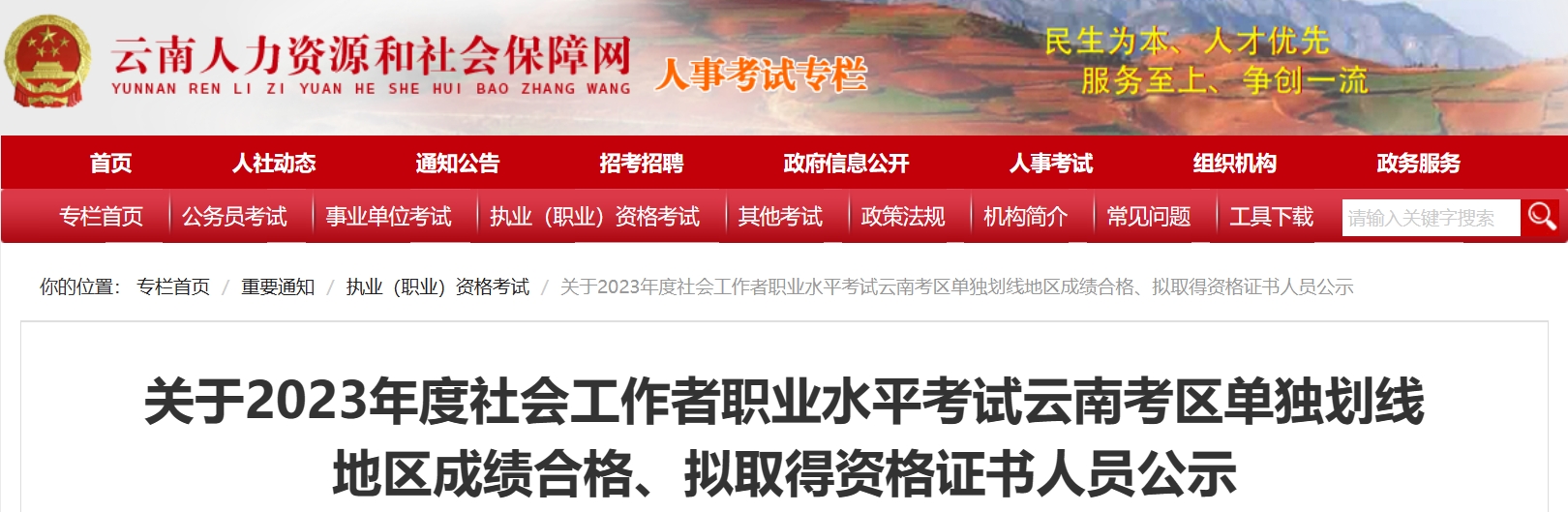 附件:2023年度社会工作者职业水平考试云南考区单独划线地区成绩合格、拟取得资格证书人员公示名单(下载链接http://hrss.yn.gov.cn/ynrsksw/i1145.html)