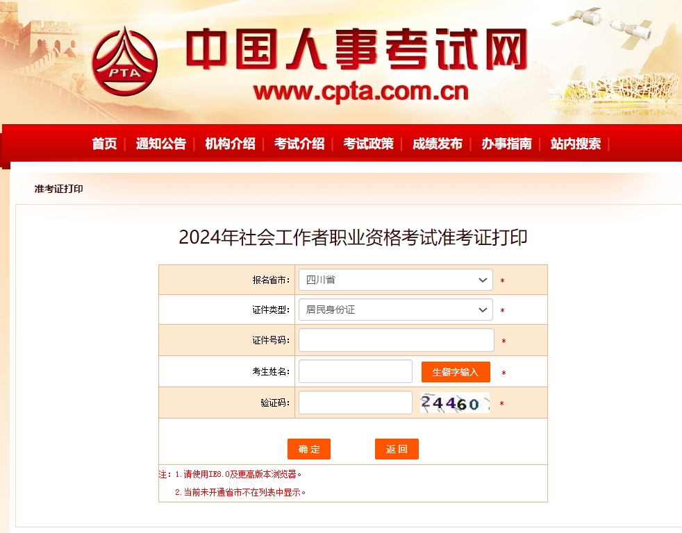 2024四川社会工作者准考证打印入口原定于6月11日至6月14日开通,小编进入中国人事考试网,查询到页面显示2024年四川社会工作者准考证打印时间为6月10日0:00-6月16日23:59.准考证打印入口提前一天开通,提醒考生按时打印准考证。