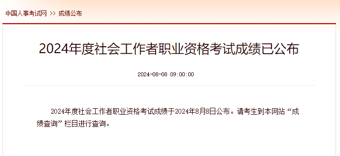 8月8日,中国人事考试网发布《2024年度社会工作者职业资格考试成绩已公布》公告,通过阅读以上公告我们得知:2024年社工考试成绩查询入口8月8日开通,考生可登录中国人事考试网查询2024年社工考试成绩!