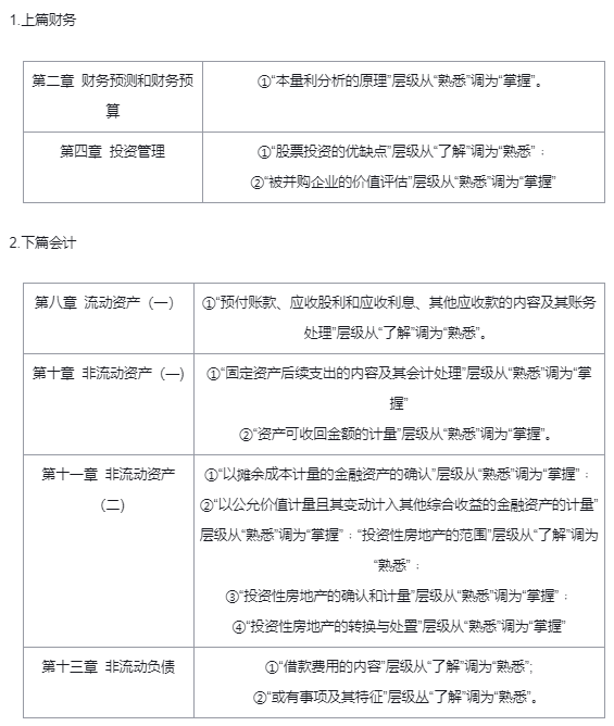 了解的内容主要集中在基本概念、作用、原则和特点,主要考核对基础原理的把握;熟悉的内容主要是基本规定,主要考核法律法规知识及其简单运用;掌握的内容是关于会计实务的重点规定,主要考核相关法规在实务中的具体运用,以及对实务中疑难问题的综合处理。