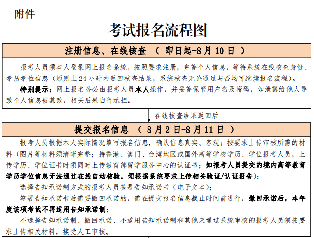 1.提交报名信息时间为 2023 年8 月2 日至8 月11日。注册信息原则上 24 小时内返回核查结果,建议报考人员提前完成用户注册及学历、学位信息补充,以免错过报名。为加强报名证明事项告知承诺制事中监管,自今年报名起,如报考人员提交的境内高等教育学历学位信息无法通过在线自动核验,应在报名前及时登录中国高等教育学生信息网(学信网)进行验证/认证,下载相关 PDF 格式在线验证/认证报告,报名期间按要求上传相关验证/认证报告,接受人工核查,具体操作方式参见中国人事考试网(http://www.cpta.com.cn/,下同)“考生问答”栏目内容。
