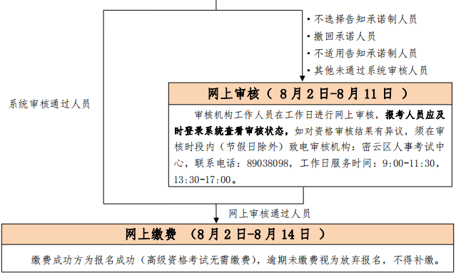 3.网上缴费时间为2023年8月2日至8月14日。报考初、中级资格考试的人员,完成报名提交并通过审核即可在规定时段内进行网上缴费,缴费成功方为报名成功,报名成功后已缴费用不予退还;报考高级资格考试的人员,完成报名提交并通过审核即为报名成功。