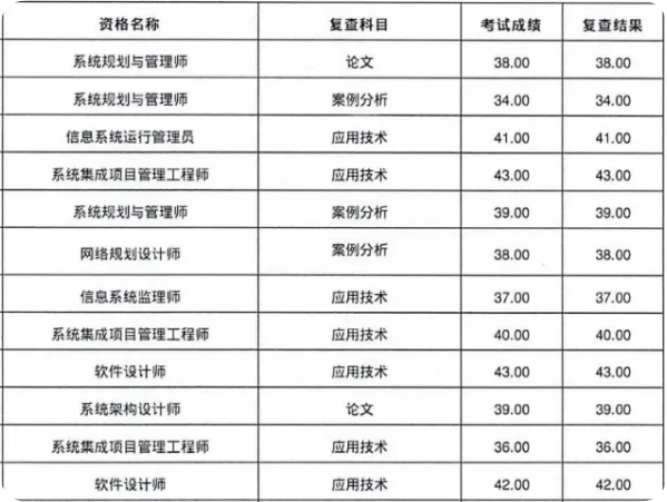 从附件的成绩复查答复表来看,复查人员的成绩没有变化!2024年下半年山西软考成绩复查结果部分如下图: