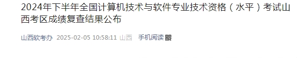 2024年下半年山西软考成绩复查结果详见原文,原文链接:https://mp.weixin.qq.com/s/ypC9Z8i_XB0IgAM66IEjJw