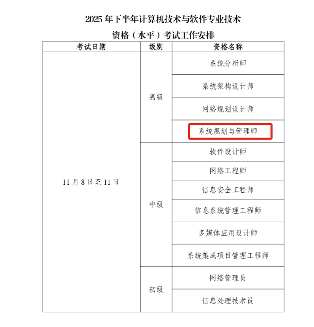 二、2025下半年系统规划与管理师考试时间:2025年11月8日至11日