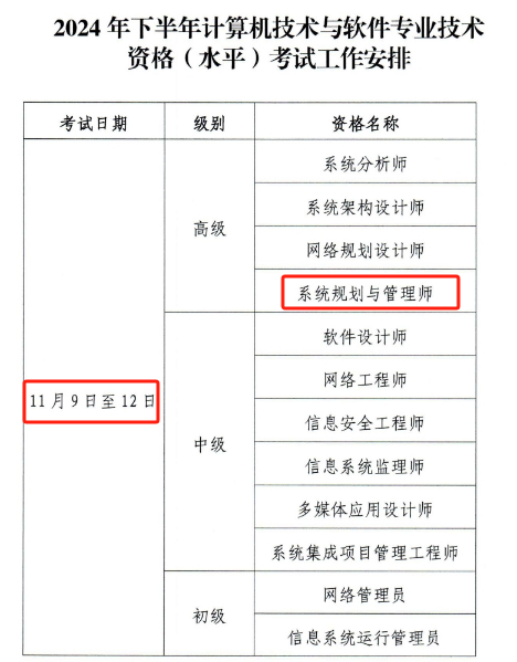 根据人社部发布的计划,2024年下半年软考系统规划与管理师考试定于10月9日至12日进行(部分信息提到11月9日至12日,请以官方最终通知为准)。考试形式为计算机化考试(机考),采取科目连考、分批次的方式进行。