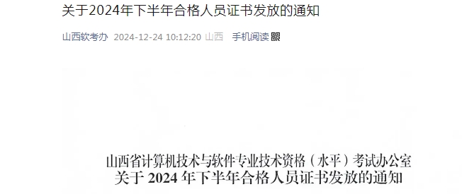 2024年下半年全国计算机技术与软件专业技术资格(水平)考试山西考区合格人员证书采用EMS邮寄和现场领取两种形式发放,现将具体办理事项通知如下:
