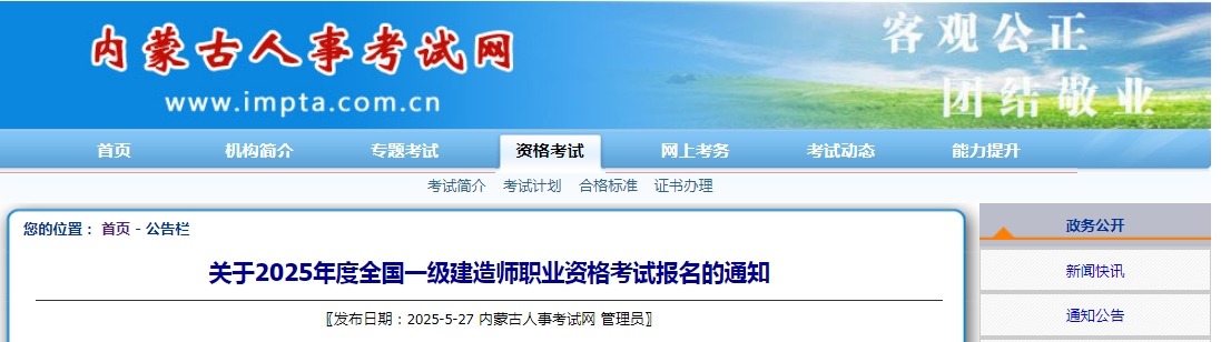 2025年度全国一级建造师职业资格考试统一实行网上报名,网址:https://zg.cpta.com.cn/examfront。