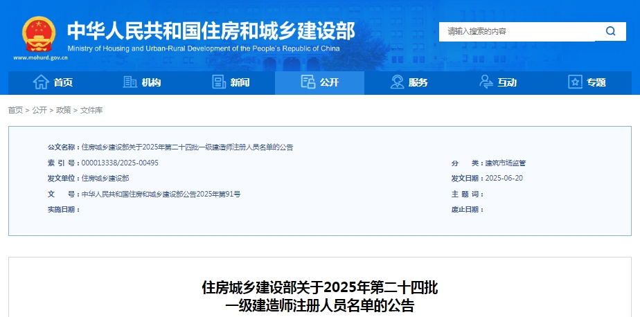 2025年第二十四批一级建造师注册人员名单公告已发布,本批次共20532人符合一级建造师注册条件,其中,初始注册共1046人,延续注册3589人,增项注册256人,重新注册15641人。
