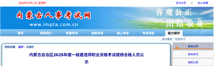 12月10日,内蒙古人事考试网公示2025年一级建造师合格人员名单,共2078人。公示期至12月19日,期间接受社会监督。名单人员均已签署告知承诺制,承诺信息真实有效。