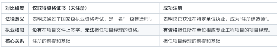 简而言之,证书是资格证明,注册是执业许可。只有将证书注册到一家具备资质的单位后,才能以注册建造师的身份合法地从事项目经理等管理工作,实现其最大的职业价值。
